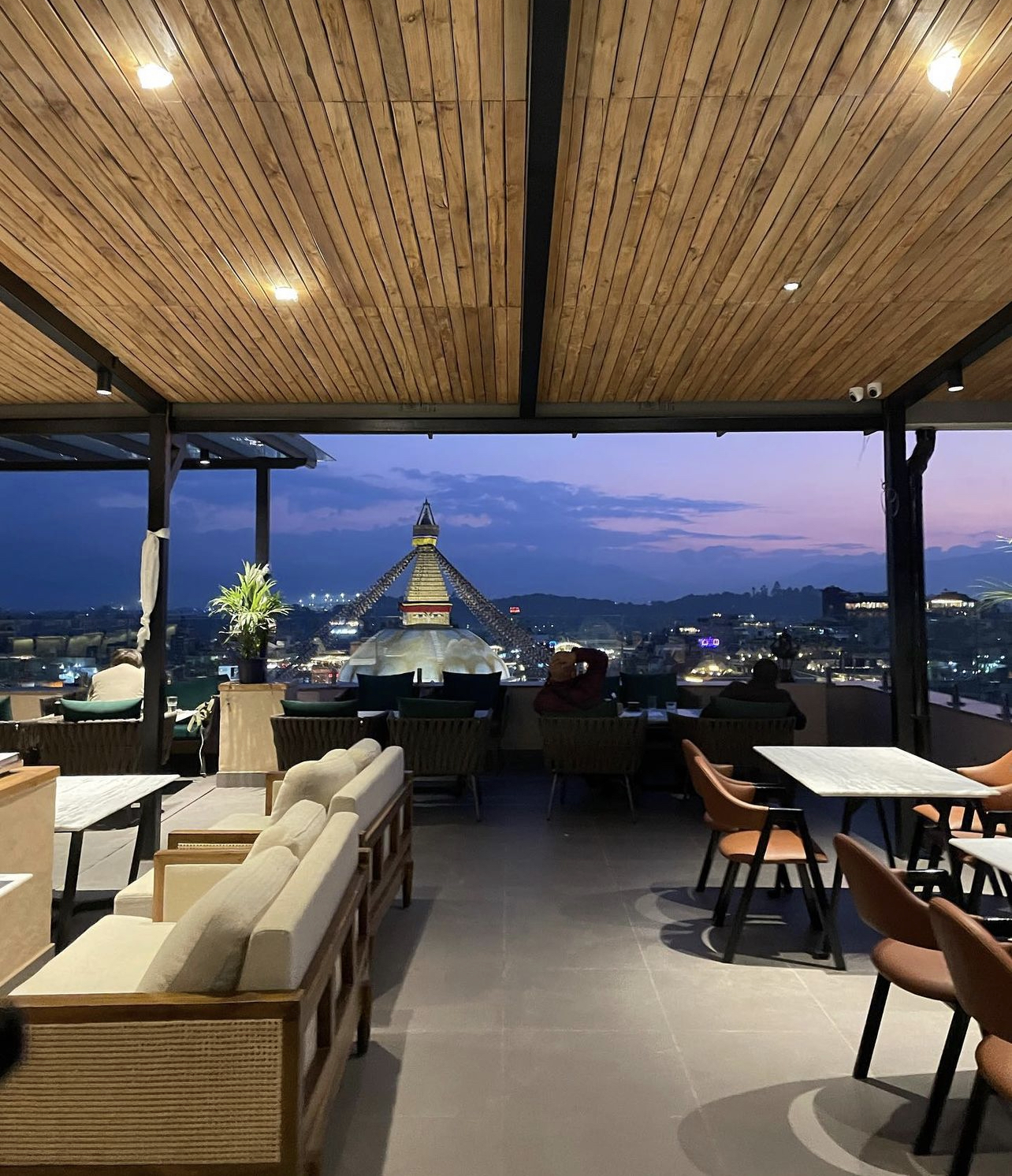 THE ROOFTOP OFFERS NEPALESE DELICACY AND CONTINENTAL FOOD AND VARIETIES OF ALCOHOLIC AND NON ALCOHOLIC BEVERAGES. IT IS ALSO ONE OF THE TOPMOST FAVOURITE SPOTS TO HANGOUT WITH FRIENDS,READ A BOOK WITH A CAPPUCCINO AND JUST ADMIRE THE TIMELESS BOUDHANATH STUPA.